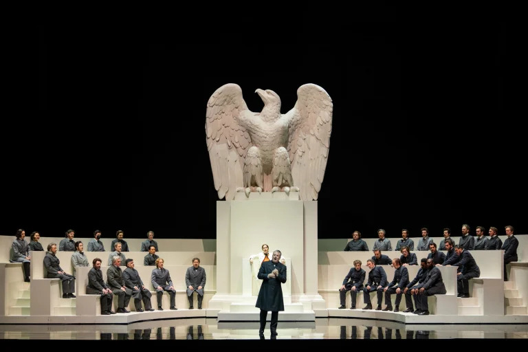 Эту инсценировку отличает умелая работа оформителя Уильяма Орланди со сценическим пространством Оперы Бастилии, в котором все мизансцены идеально просматриваются, несмотря на использование в сценографии крупных элементов. Гигантский орёл универсальным символом власти доминирует в I картине, огромные «каменные змеи» в сочетании со всполохами живого огня держат, как античные колонны, оформление II картины; циклопического размера виселица с угрожающими чёрными воронами служит в III картине порталом в ад разоблачения, а абстрактный интерьер бального зала VI картины становится фоном финальной трагедии. Перед нами идеальная оперная среда, одновременно и зрелищная, и убедительная, музыкально ориентированная.
