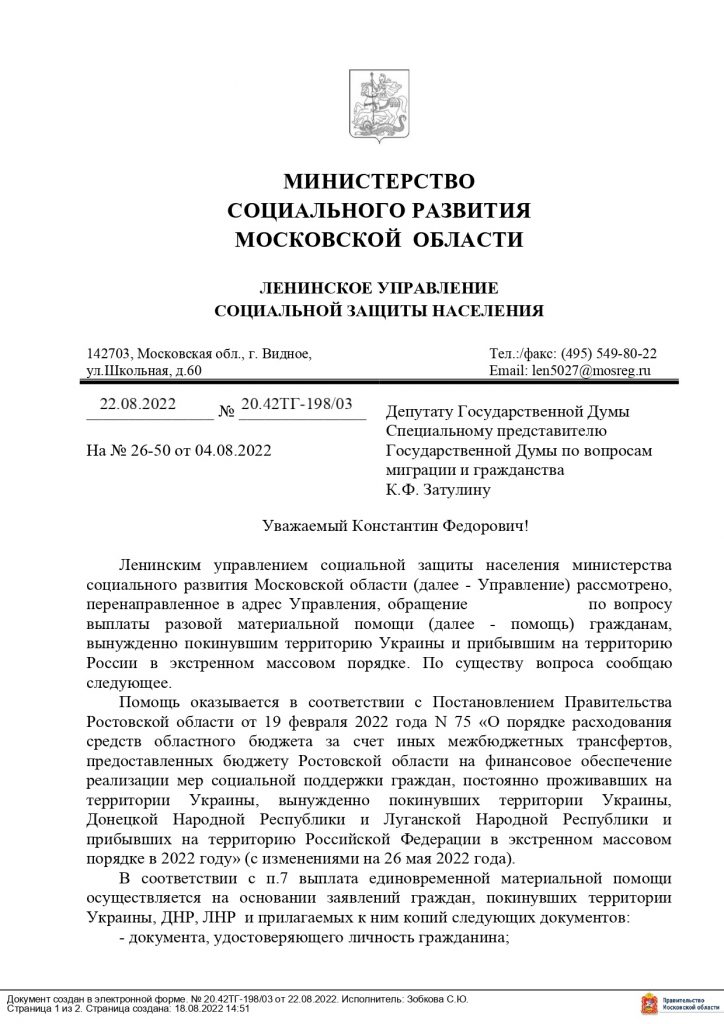 В приемную депутата поступило обращение граждан по вопросам задержек и прочих трудностей, связанных с выплатой материальной помощи гражданам, в экстренном порядке покинувшим территорию Украины. В интересах обратившихся Константин Затулин направил запрос в Министерство социального развития Московской области.